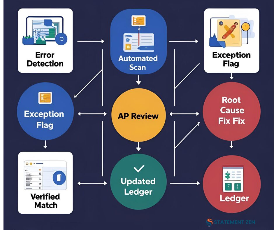 - Exception flagging for missing invoices, overcharges, or mismatched amounts
